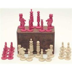 A small mid 19th century English bone chess set, in red stained and natural of sectional barleycorn form, in wood box, kings 2.75ins £50-80