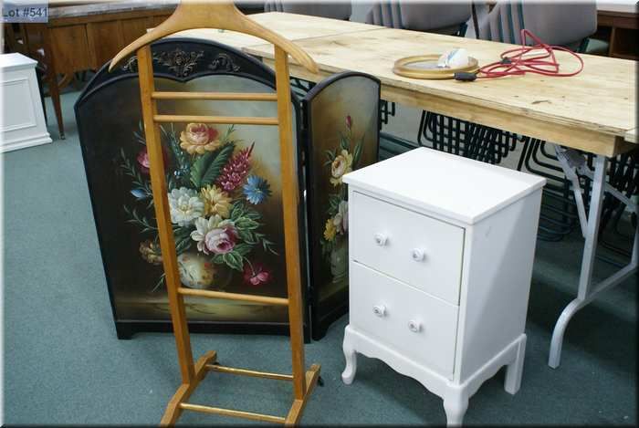 A small modern painted three panel screen and a two drawer end table and a gentleman's suit rack on castors
