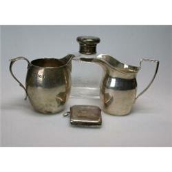 A small silver cream jug, maker CE, London 1945, of plain barrel shape with raised spout and scroll handle, 8cm; another Edwardian silver cream jug, maker MB, Birmingham 1904, with plain body, broad spout and angular handle, 8.5cm, also a glass dressing table bottle with silver cap and a Victorian plain silver vesta case, Birmingham 1899, 5cm, 7oz (4) £70-100