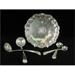 A small silver salver, Mappin & Webb 1905, a pair of Georgian Scottish Old English pattern silver sauce ladles, maker F. L. N. and a pair of Georgian silver salt spoons Est. 80/120
