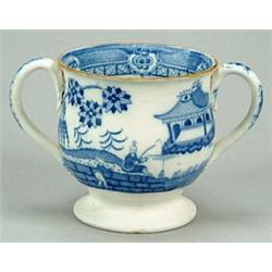 A small two-handled loving cup, of squat inverted baluster shape on a low pedestal foot, with ochre rim, printed in blue with a chinoiserie scene featuring buildings, a long jetty, a fisherman, and an apparently bare-bottomed attendant, with an interior geometric border with scenic and flower reserves, height 9.4cm, unmarked, circa 1800-10 (restoration to rim)