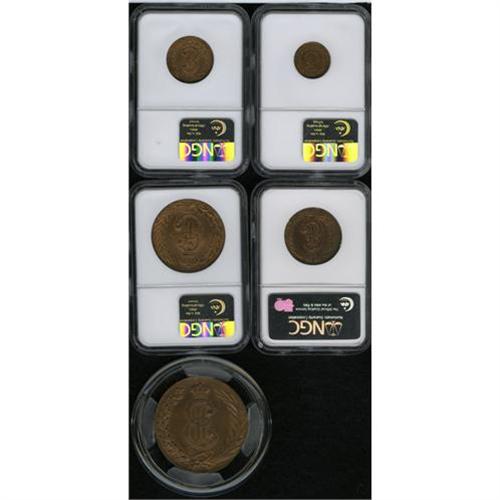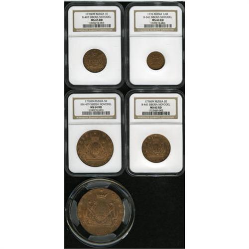 <B>A spectacular 1776 Novodel Siberia 5-piece set as follows:</B></I> Polushka (1/4 Kopeck), B-341, KM-N90, MS64 Red NGC; Kopeck, B-407, KM-N92, MS65 Red NGC; 2 Kopecks, B-441, KM-N93, MS62 Red NGC; 5 Kopecks, B-479, KM-N94, MS64 Red NGC; and a 10 Kopecks, B-521, KM-N95, too large for an NGC holder, but Choice Red UNC and a spectacular at that!<BR><BR><b>Shipping:</b> Coin/Currency (<a target="_blank" href="http://www.heritageauctions.com/common/shipping.php">view shipping information</a>)