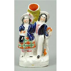 A spill vase group of a boy and girl with a lamb, modelled standing before a tree, partially coloured, 16cm high, mid 19th century (restored chips to hat)