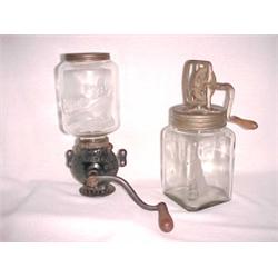 A square pressed glass churn and a wall mount grinder, glass churn with tin screw top with exposed metal gears and paddle, 2 qt; and a Crystal No. 3 cast iron wall mount grinder with glass jar and bottom screw lid, wooden handle, each measures 12 1/4" high, both C. 1900's