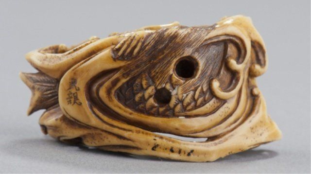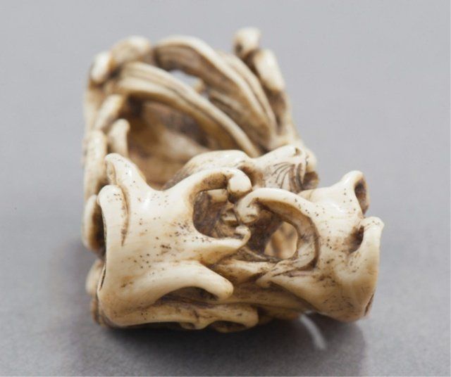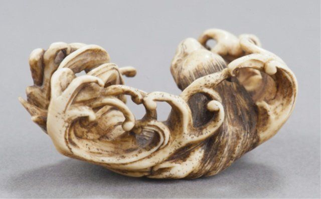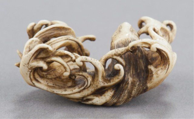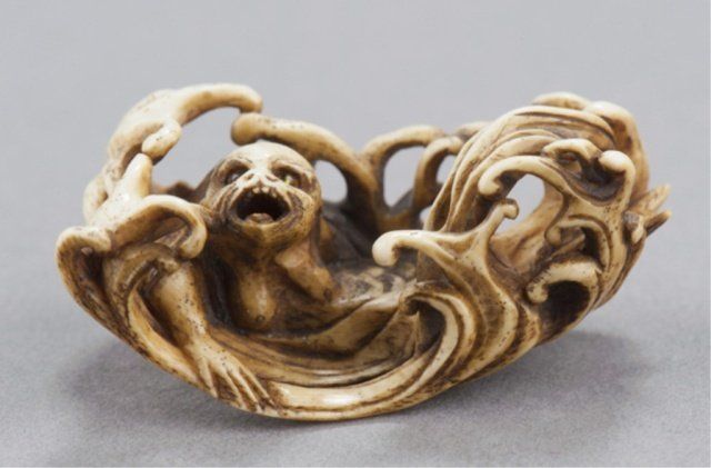 By Toyosai Mitsuchika, Tokyo, Mid 19th century. , Mid 19th century. She is emerging from undercut waves that appear as filaments of water, she has a snarling open mouth showing three teeth above a partially extended tongue, the eyes are in yellow horn with black centers. Signed on the underside, Mitsuchika. 1 7/8in (4.7cm). Provenance: Ex Scott Meredith collection.