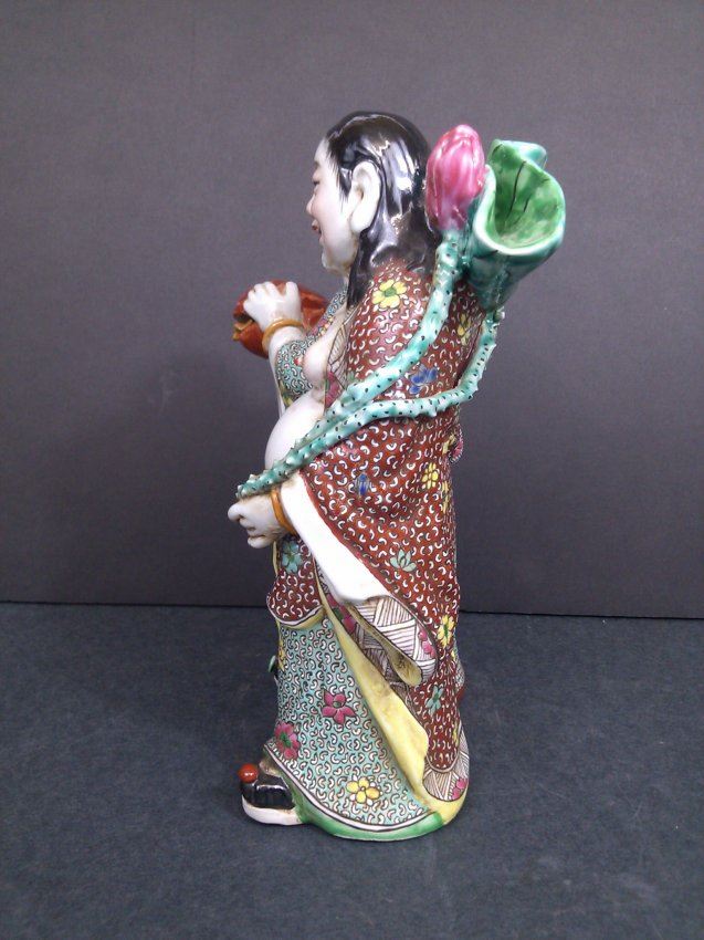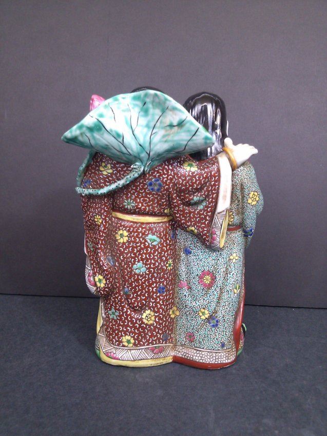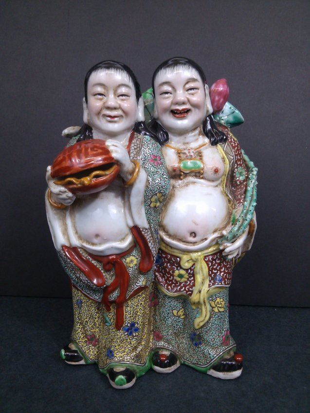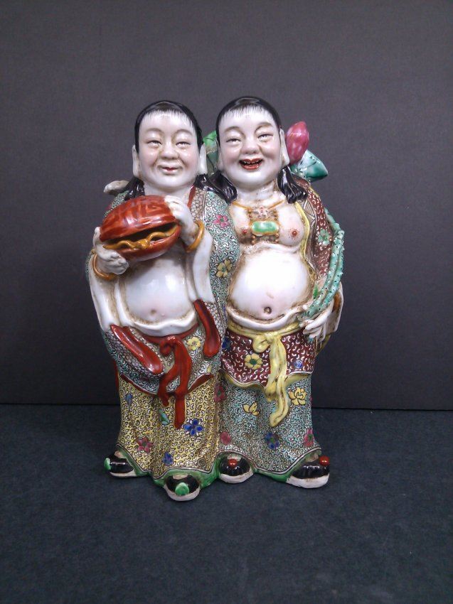 A statute of the two immortal He-He twin figures; one holding a single lotus with giant leaf on his back and the other a Chinese golden head box turtle, wearing elaborate decorative ropes and shoes. A reminder symbols of harmony and union. Late Qing - Early Republic period seal mark. 9"H x 6"W