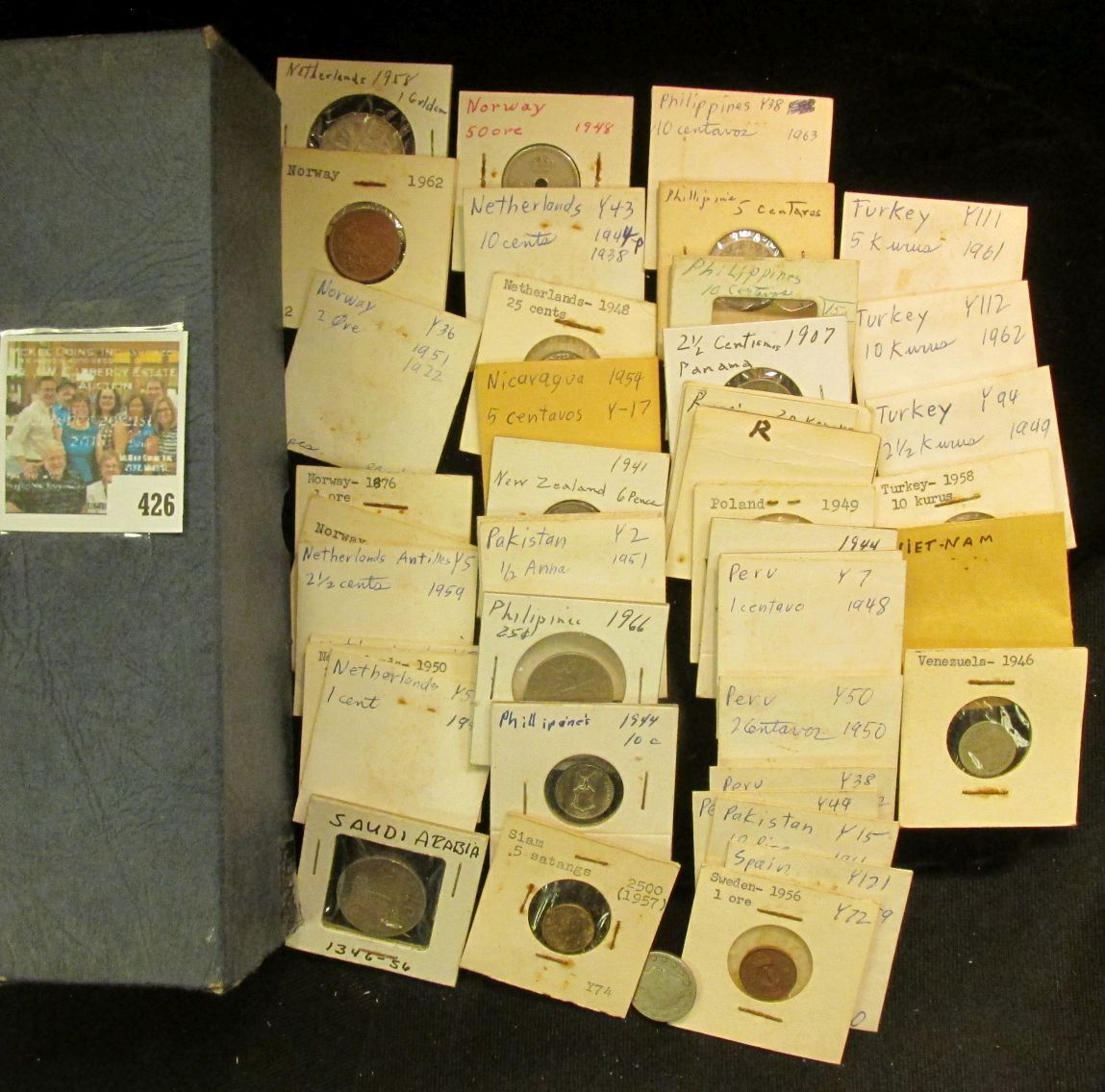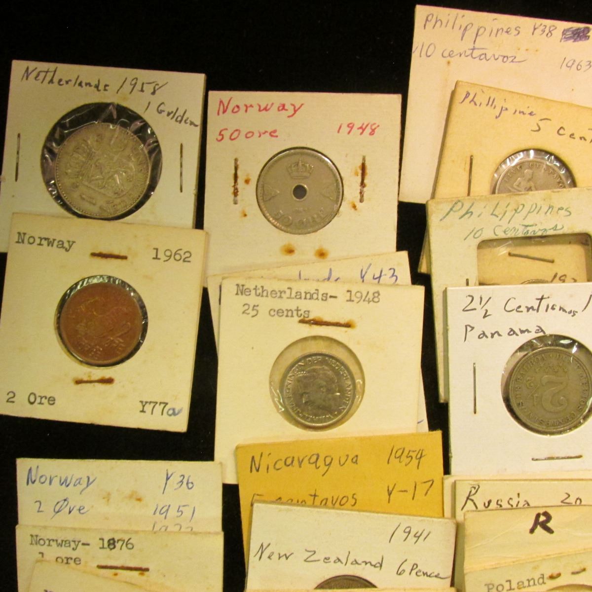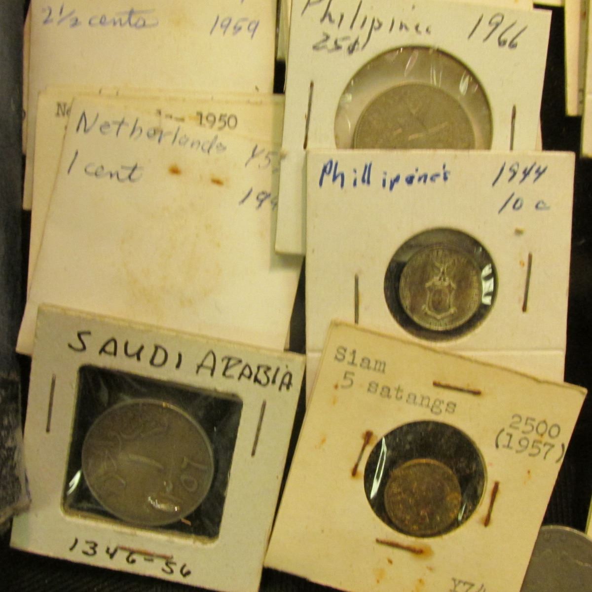 A stock box partially full of mostly Foreign Coins including lots of Silver. Includes 1941 New Zealand Silver 6 Pence, Netherlands 1948 25c BU, 1944 Netherlands 10c BU, 1958 Netherlands 1 Gulden, 1907 Panama 2 1/2c; couple of 1944 Philippines 10c, lots of other foreign and a 1902 Liberty Nickel.