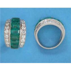 A stylish French 3-row ring, set with a central row of 9 graduated invisibly set rectangular cut emeralds, flanked by brilliant cut diamonds £7,000-10,000