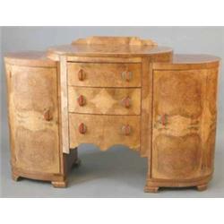 A stylish art deco burr walnut sideboard, the oval centre section of three graduated drawers fitted chrome and orange bakelite handles flanked by two rounded end cupboards on block feet, 5ft.7ins £300-400