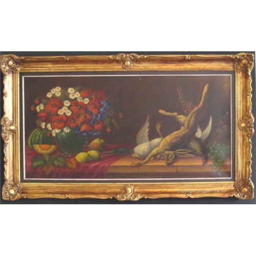 Austrian school, Still life ? Original fine art oil painting, mid 20th century, signed Aicha. This monumental Still life is painted on stretched canvas, signed and dated by the artist and set in a superb ornamented gilt frame. Overall size is 56 x 33 (!). The sheer dimensions of this painting make it awesome. The game freshly caught and the fruit and flowers on the table are life size and impress by their detail. The composition is harmonious and the colours bright. The elegant play with light and shadow is typical of the 17th-century genre. A prestigious piece that will be the jewel of any dining room. Certificate of authenticity and origin provided. Sales price includes US front door delivery.