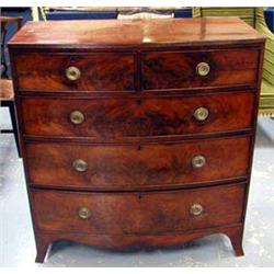 A superb George III, flame Mahogany, bow front chest of two short and three long reeded drawers, standing on splayed feet, 41".