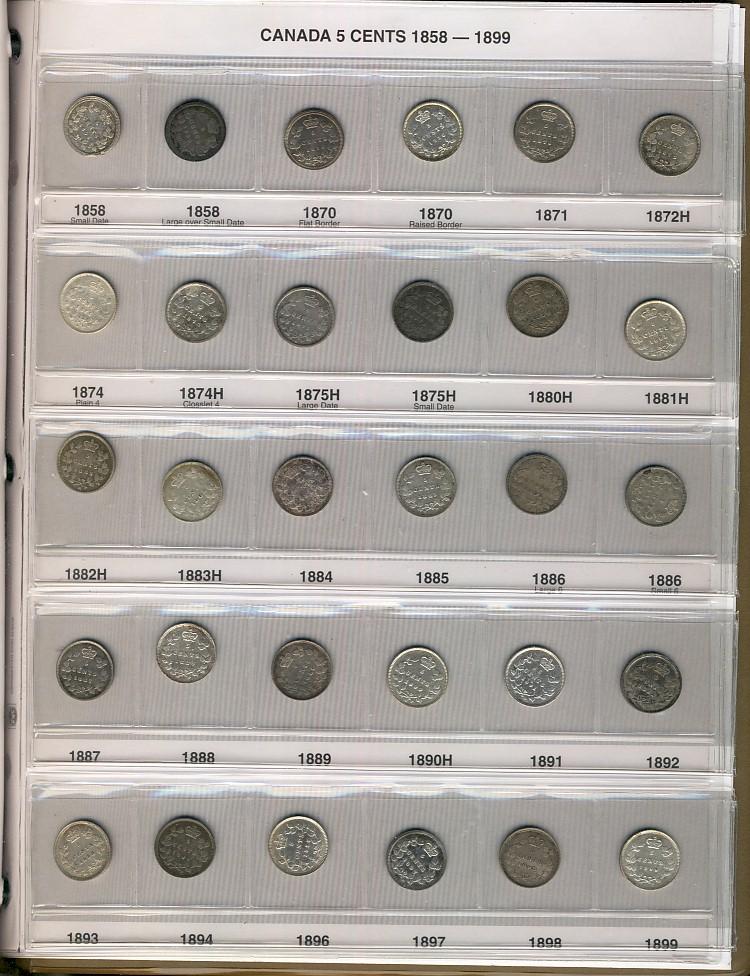 A superb and virtually complete collection of Five cent silver pieces. 1858 to 1920. All the major key dates are included. 1858 LD, 1875H SD, 1875H LD, 1884, 1889, 1894, 1900 RD O, 1909 Ptd. Grades vary from G-4 to MS63. Should be viewed. A very nice collection in average condition. includes a small number of duplicates.