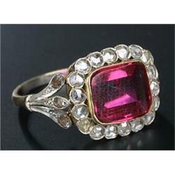 A synthetic ruby and rose diamond oblong cluster ring, centred with a synthetic-ruby tablet withi...