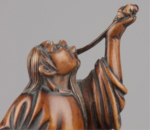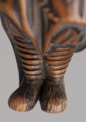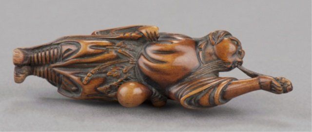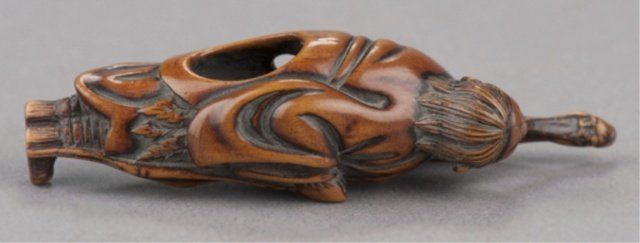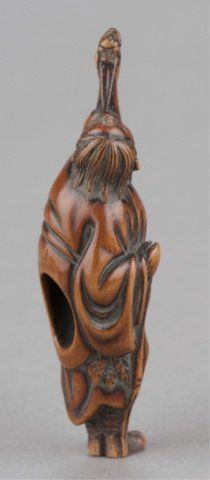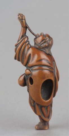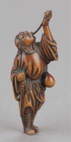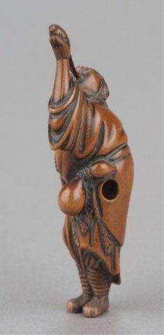 By Tsuji, Osaka, Late 18th century. He stands with his left arm extended and supporting a simulacrum of his spirit which is connected to his mouth by the vapor trail of his breath, a gourd is secured to his sash. Signed inside the himotoshi with the artists one character signature. 2 3/4in (7.1cm). Provenance: Ex Richards collection. Purchased from R. Koscherak, 1958. Exhibited: the Student Center (August 29 - September 25, 1960)
