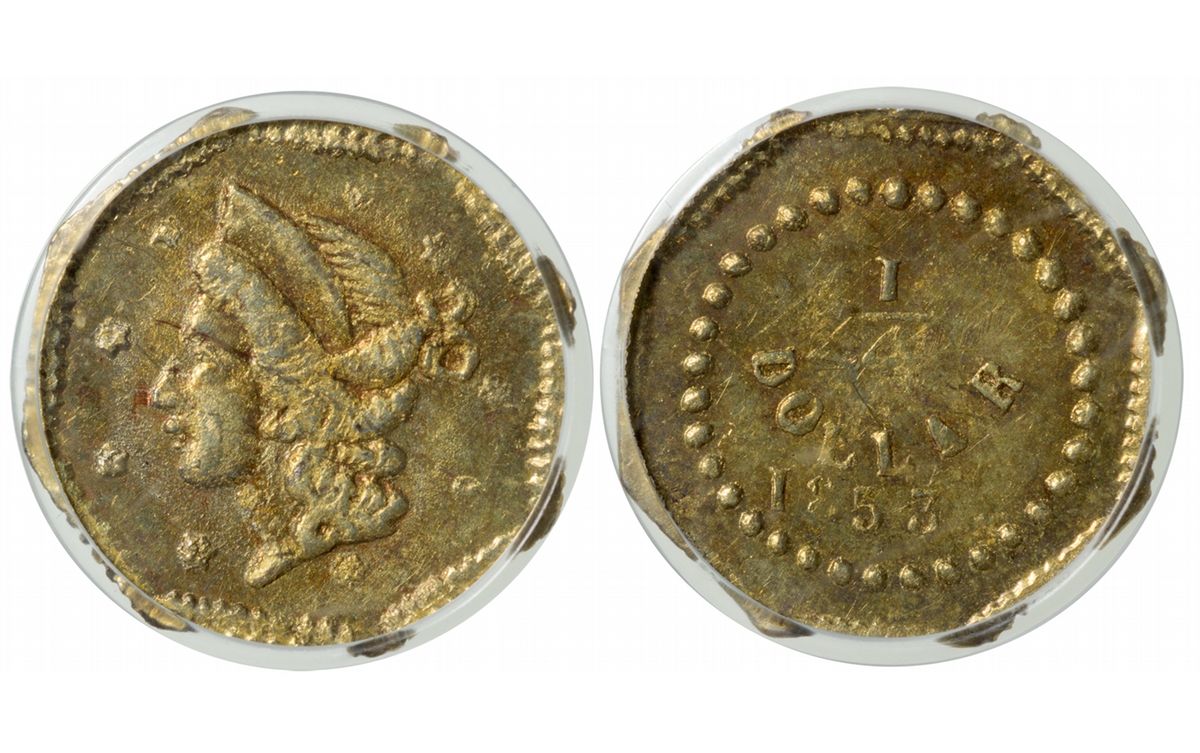 1853 Jack Totheroh accepted the challenge of collecting small California gold not only by die marriage (the BG number), but also by differences in the appearance of the die during use (the die state). In foggy San Francisco, the makers of these coins were at their wits’ end to fight off rust, and frequently resorted to grinding the die to polish it off, with indifferent success. Makers also pressed on with dies damaged by die clashing or die breaks and even "cuds," in order to meet demand. Such "imperfect" pieces are a testament to conditions prevailing in 1850s California. Dull gold with highlights of blue in field and red in recesses of design. PCGS AU58. Serial# 30035058 Totheroh Collection HKA#63312