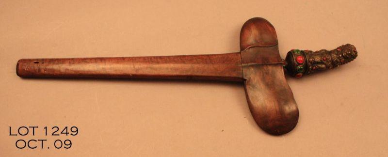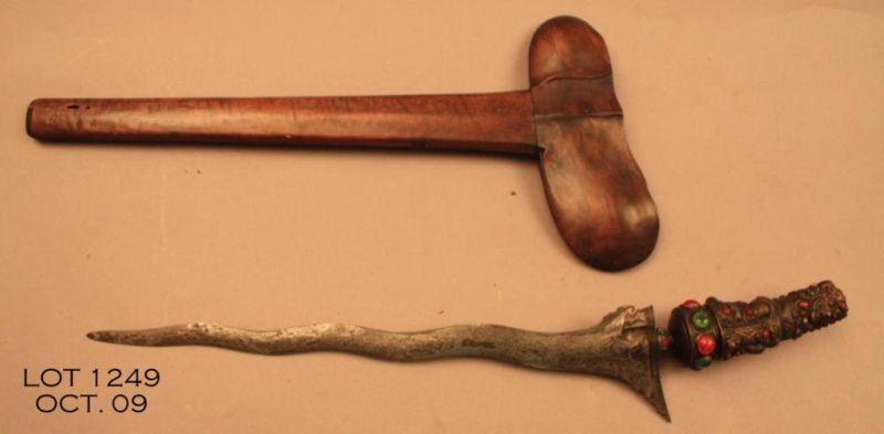 A traditional fancy Kris knife and scabbard, approx. 23” overall with a meteorite steel wavy blade, bejeweled brass grip with a deity design and contained in a wooden scabbard, the entire rig being in overall good condition for its age.Est.: $150-$300.