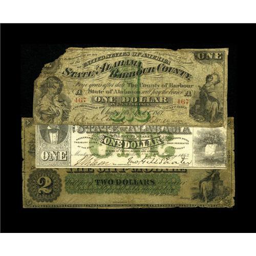 <B>A trio of Alabama Notes, Including</B></I><BR><B>Clayton, AL- Barbour County</B></I> $1 April 1, 1867 Rosene 43-1 <B>Very Good,</B></I> top left corner off<BR><B>Mobile, AL- City of Mobile</B></I> $2 May, 1865 Rosene 187E-2 <B>Fair</B></I><BR><B>Montgomery, AL- State of Alabama</B></I> $1 1863 Cr. 1 <B>AU</B></I><BR><BR><b>Shipping:</b> Coin/Currency (<a target="_blank" href="http://www.heritageauctions.com/common/shipping.php">view shipping information</a>)