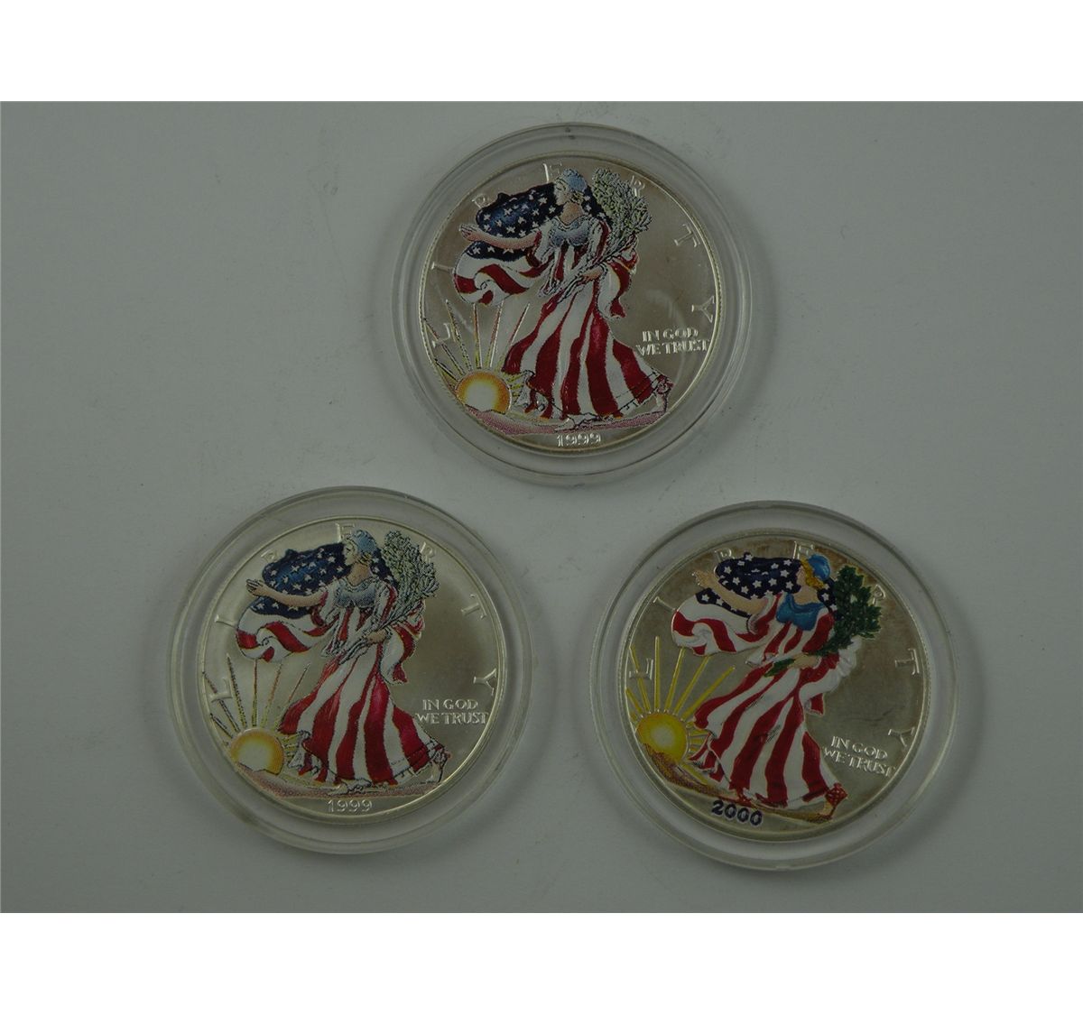A trio of Uncirculated Colorized 1 oz. Silver Eagles: 1999 (2),2000. All in custom holders from the American Historic Society. A total of 3 coins. Est.$80