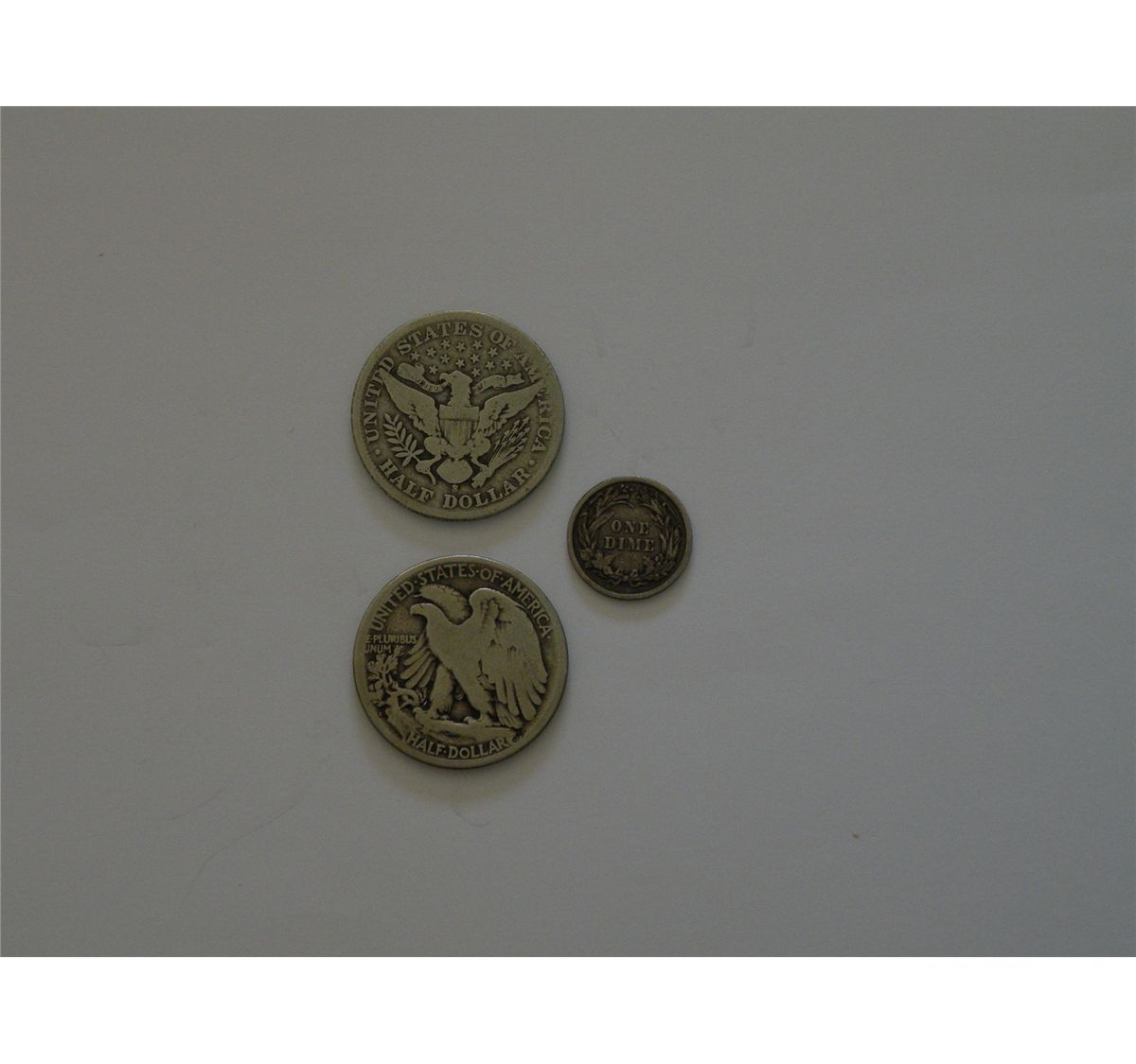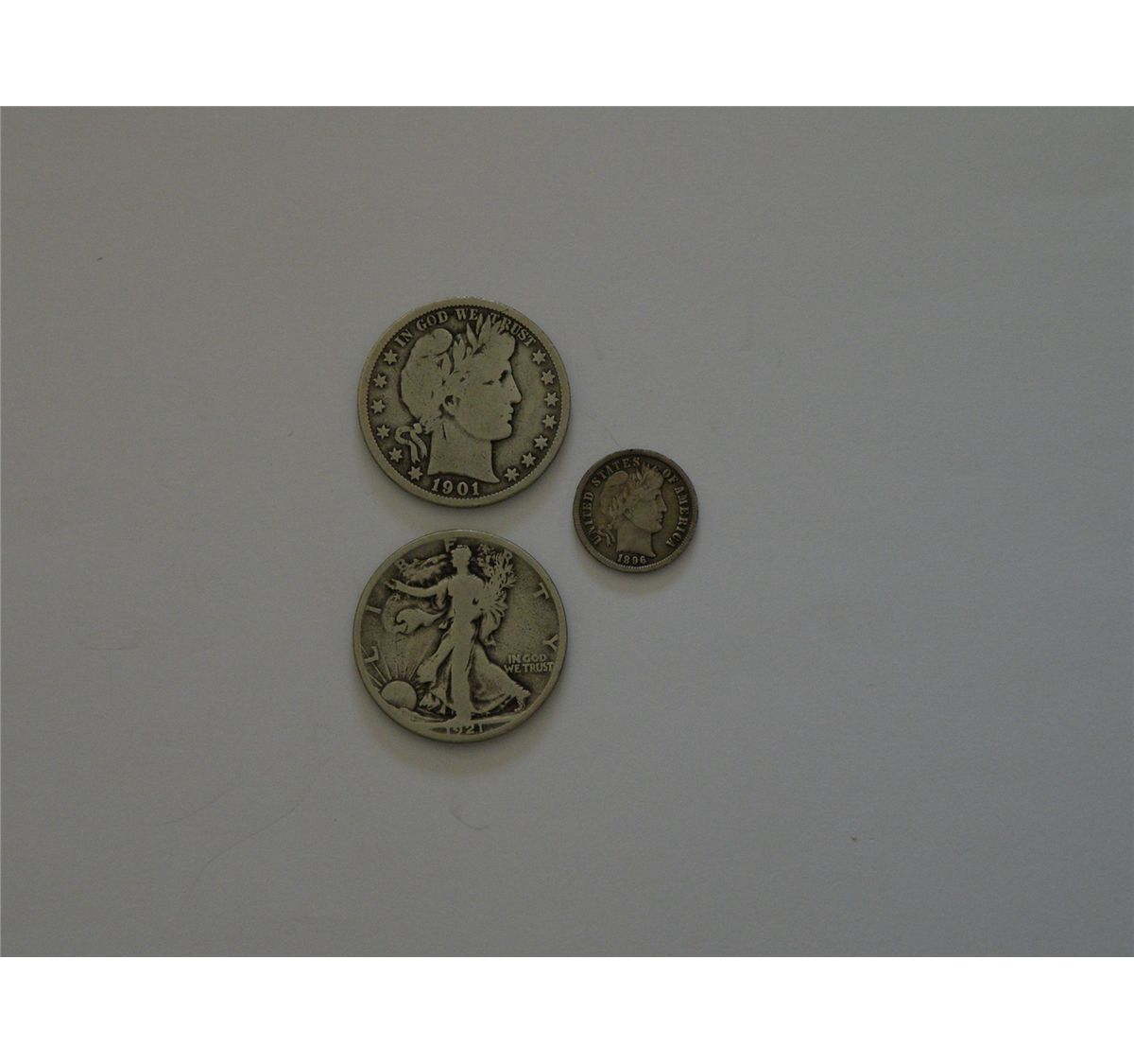 A trio of better date coinage: 10C 1896 Fine; 50C 1901-S Good; 50C 1921-S Good. A total of 3 coins. Est$90