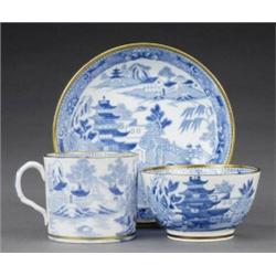 A trio, of tea bowl, coffee can and saucer, printed with Willow pattern in blue, gilt line border, c.1800