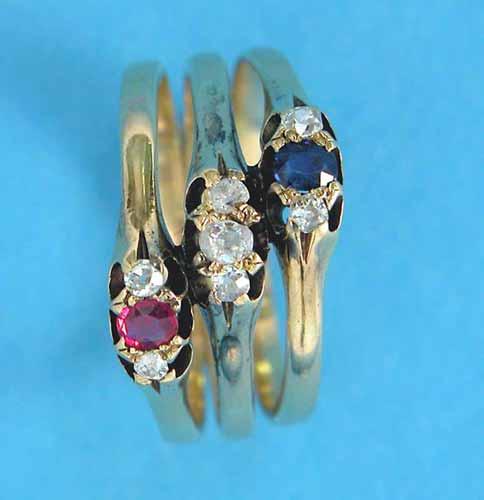 A triple band gold ring, set with a ruby, sapphire and diamonds...
