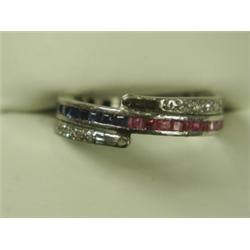 A triple eternity ring, the cental band half channel set with rubies, half with sapphires with 2 hinged half bands set with diamonds, size O (6 ways of wearing)