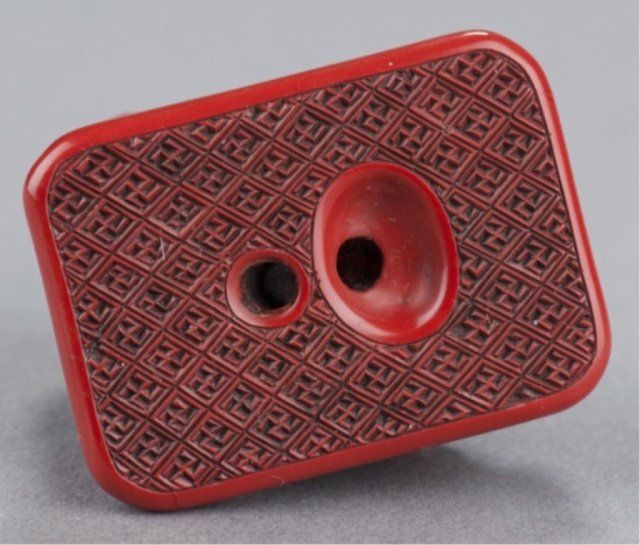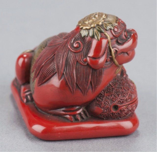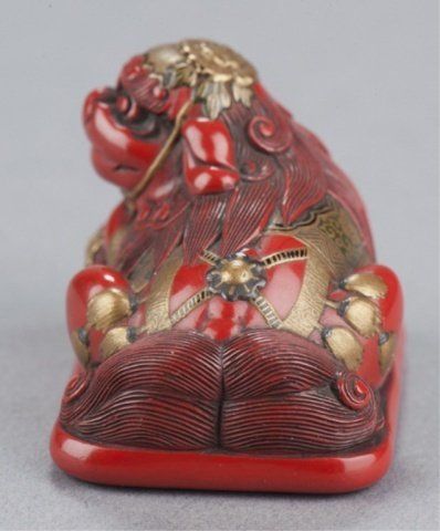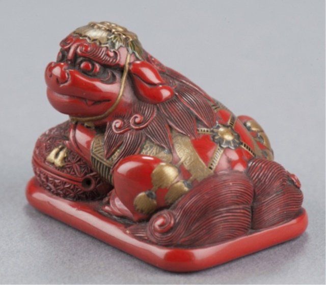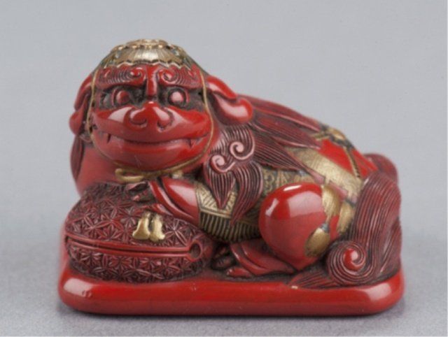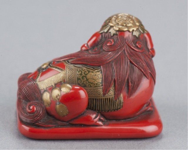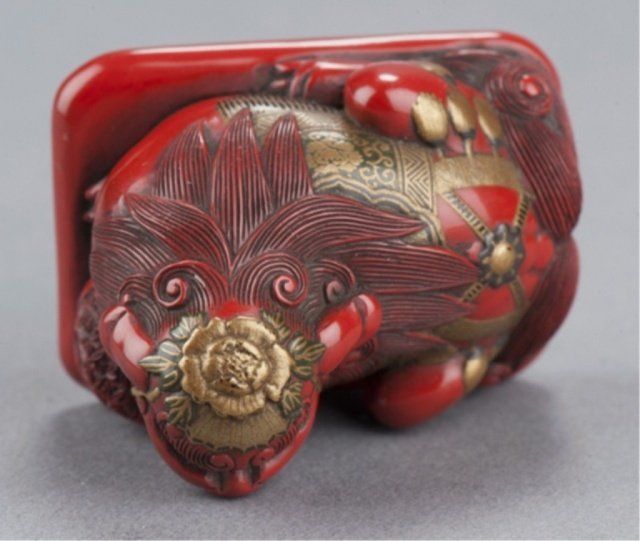 Early 19th century. Seated on a cushion and resting its front paws on a mokugyo, its adornments in gold and black lacquer include a cap secured by a ribbon that attaches under the chin and tasseled blanket that fits over its back. The mokugyo is covered with an asanoha pattern while the underside of the cushion bears a diaper pattern. One of the himotoshi is countersunk in a large area reserved for the cord knot. Unsigned. 1 1/4in (3.2cm). Provenance: Ex M.T. Hindson collection, Sotheby's, London, March 16, 1968; Lot 539. Illustrated Davey, Page 424, Fig. 1265. Ex Mrs. Isobel Sharpe collection