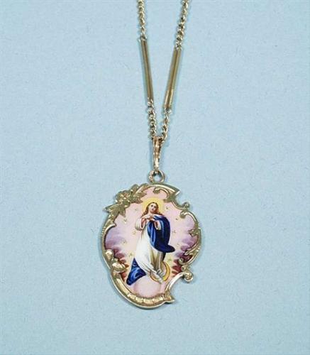 A turn of the century gold cartouche shaped religious pendant, enamelled with the figure of the Madonna. On gold chain with alternating bar and chain segments. 19" long. 800-900