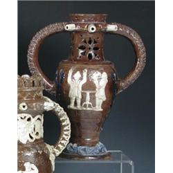 A two handled brown puzzle jug, the baluster shape with six facetted white spouts radiating from a collar on the rosette pierced neck between the fancy link applied handles, a white figural sprig on one side titled 'Nil Desp.' and on the other 'Eureka', the domed foot with blue scrolling foliage, Incised marks and date 1891, 31cm high (R) £150-250