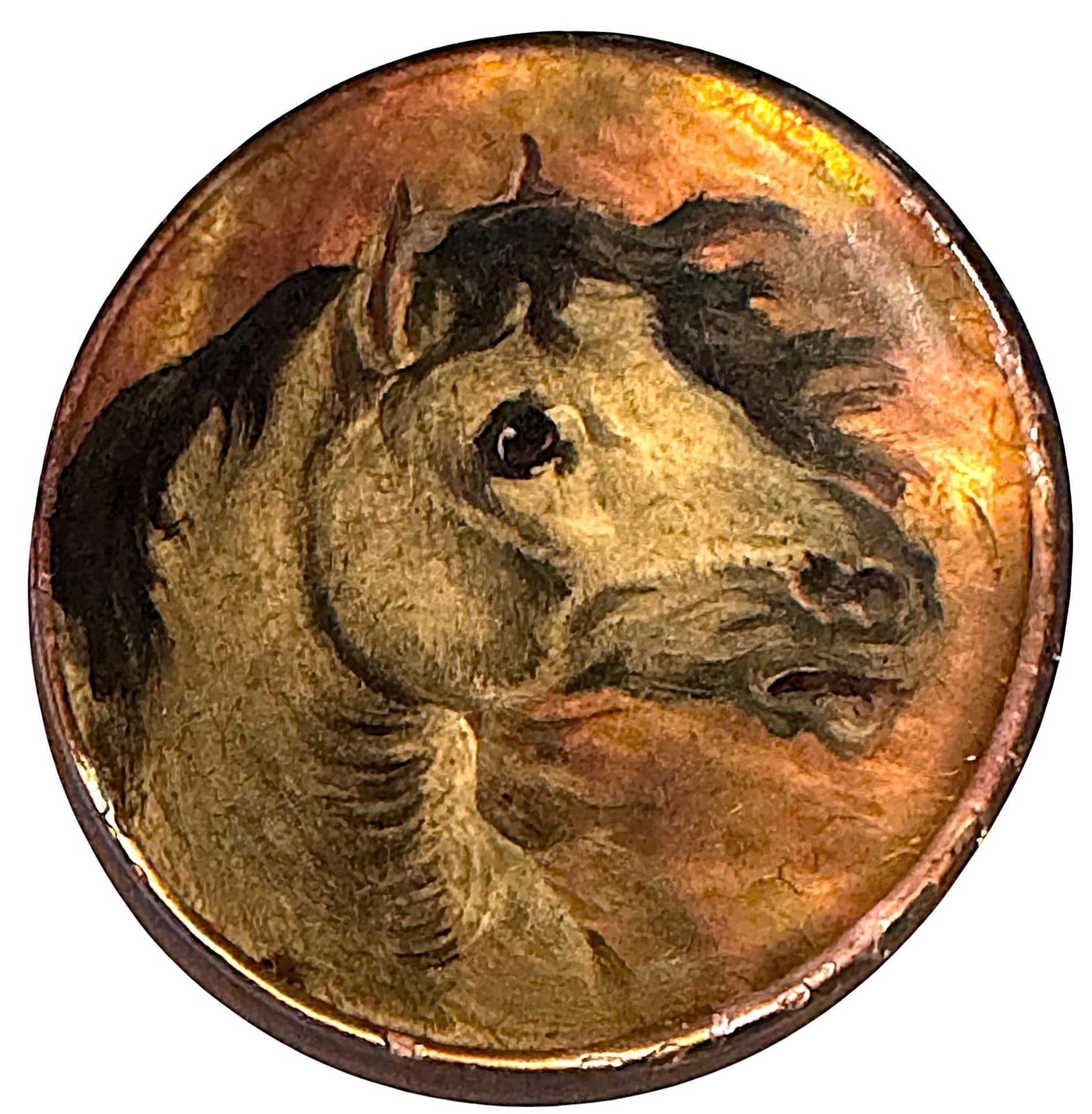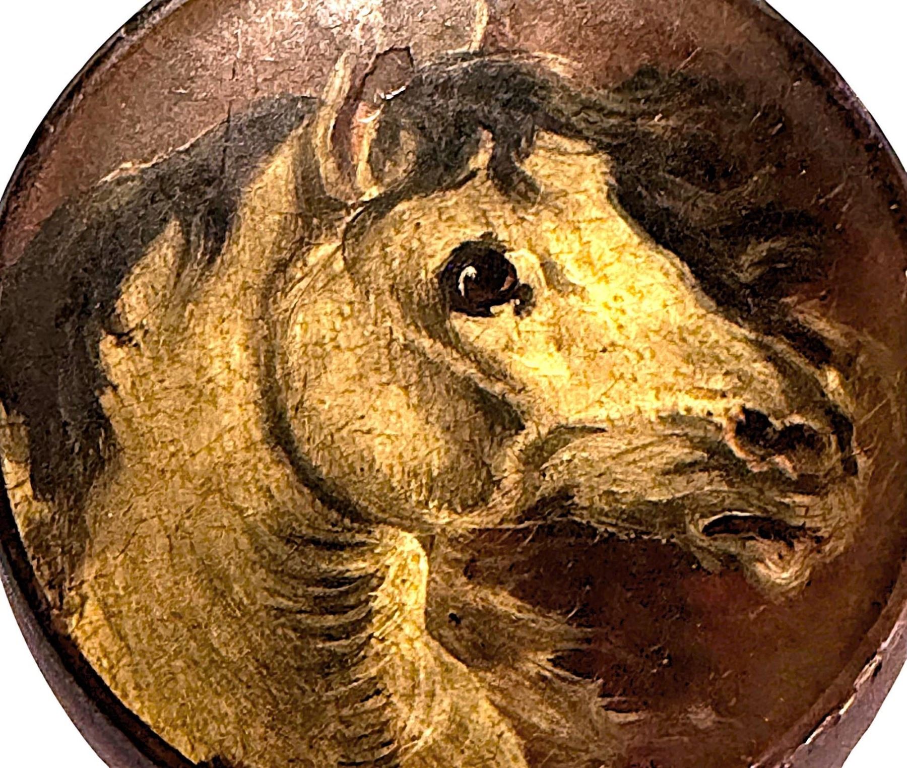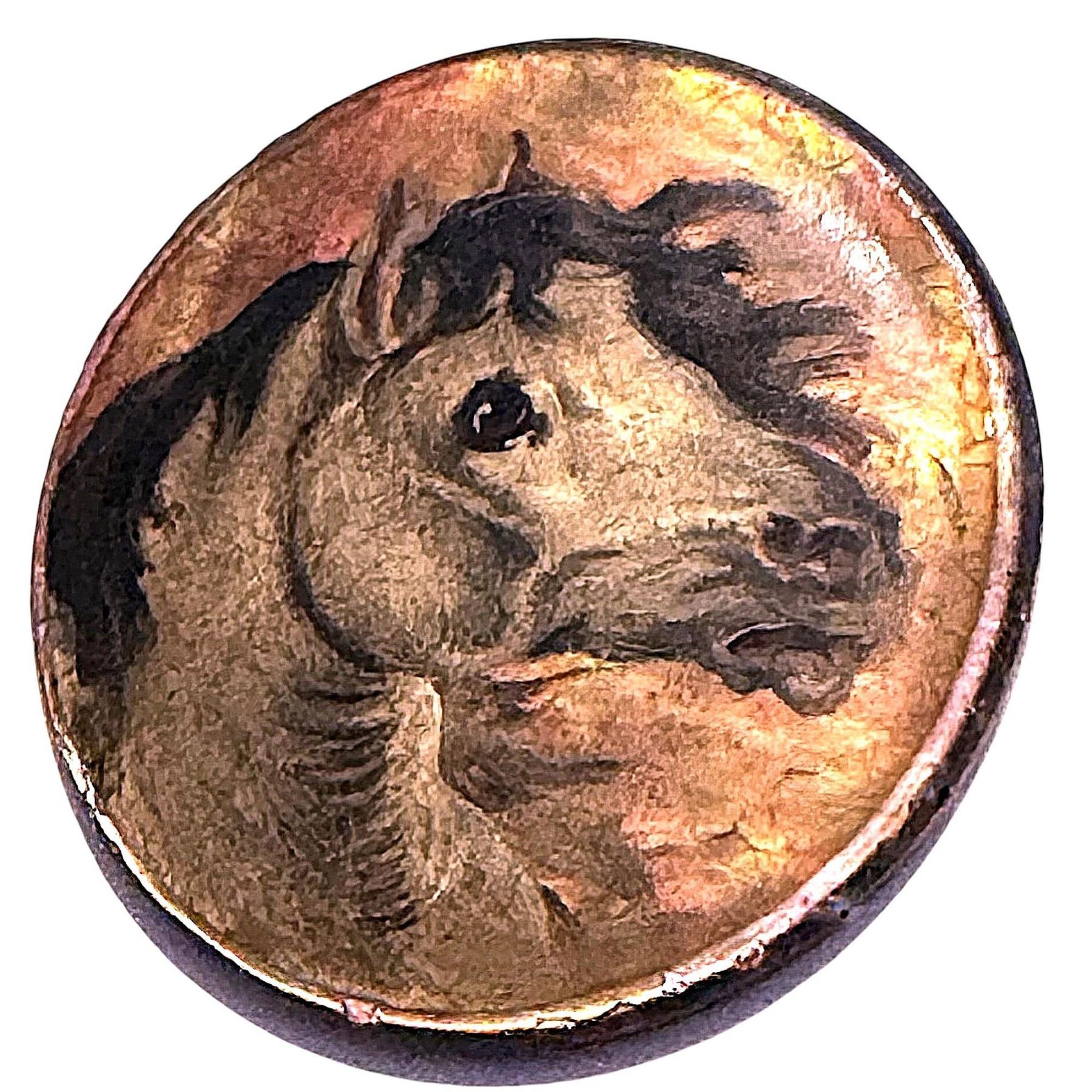 1 Medium size 19th century hand painted pearl horse button. This button from a larger set is incredibly detailed and hand painted in the Vernis Martin style. Vernis Martin paintings were a style of painting in the 18th and 19th century often created on lacquer boxes and furniture and the like. This sporting button of the Horses head is hand painted in that style and most likely was created in France at the time Vernis Martin paintings were popular. This is a rare find in buttons as there are very few buttons we can attribute to this style and artistry. Attached images show a small selection of Vernis Martin paintings in this style from a French magazine. Bruce tells us that he has several boxes in his collection created in this style and would be happy to share images of them if anyone is ever interested. We have also given you here the Wikipedia partial definition or origin of this technique. Vernis Martin is a type (or a number of types) of japanning or imitation lacquer named after the 18th century French Martin brothers: The second photo was taken at an angle so you could see some of the chatoyant color in the pearl base.The coloration in the pearl when turned around in the light changes every whi.ch way you turn and is just exquisite.