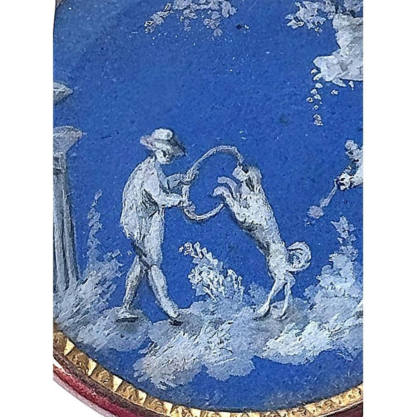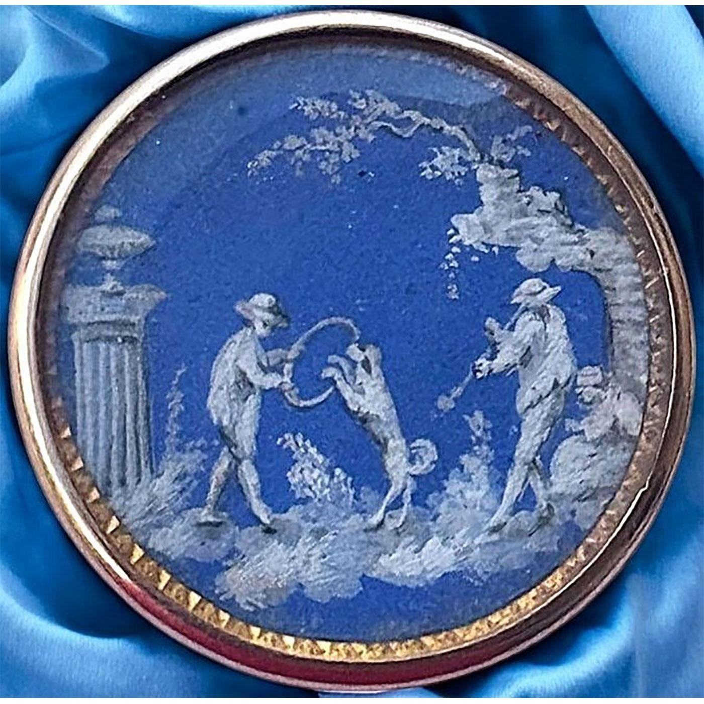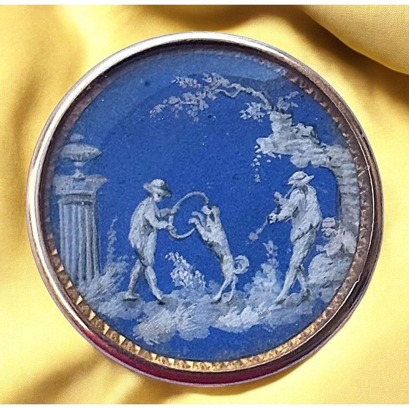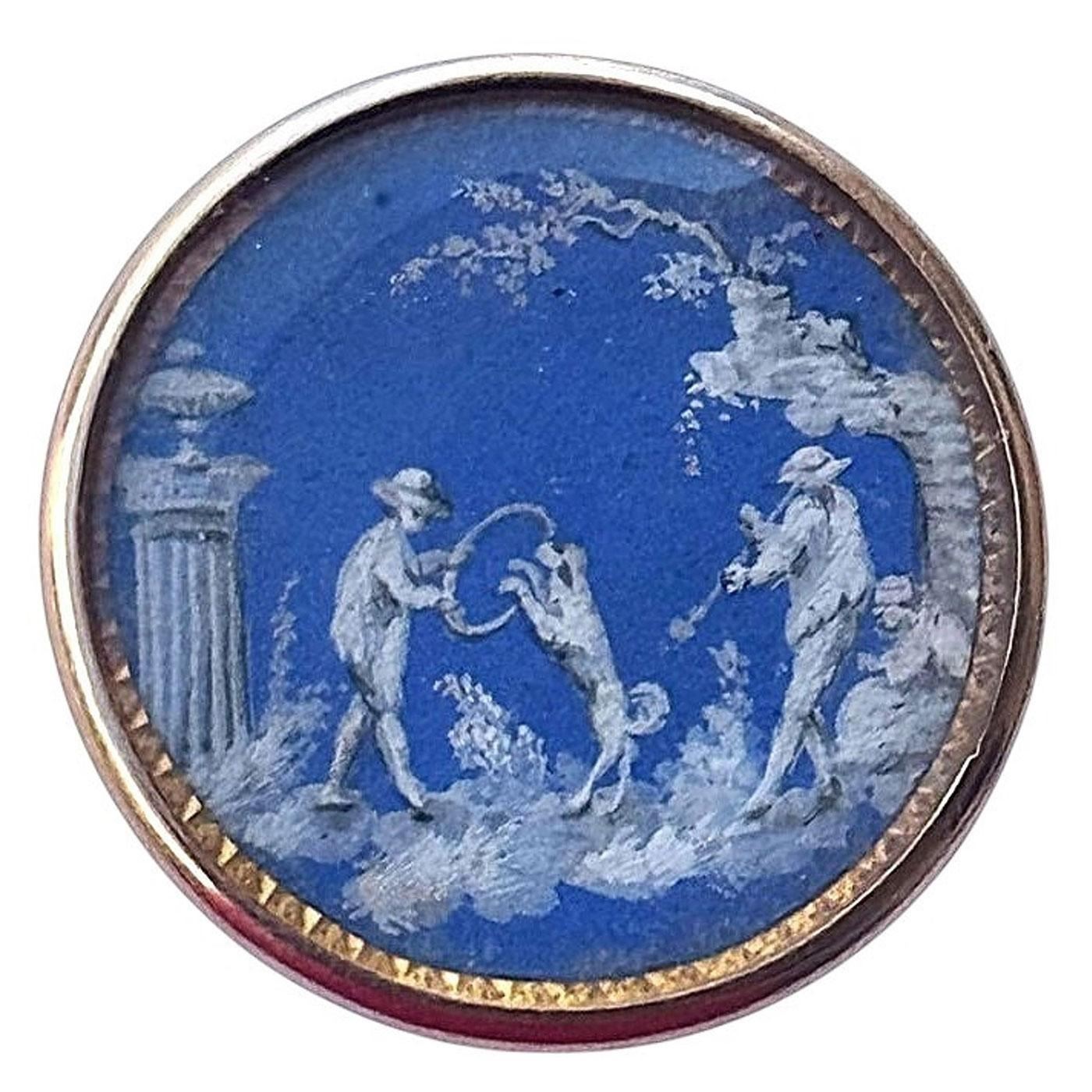 This is a button to not pass by. This incredibly detailed scene is showing a person playing a horn while another person is holding a hoop for the Dog to jump through, and another person laying on a rock watching in anticipation. This beautiful example of 18th century craftsmanship was obviously designed at a time when the Josiah Wedgwood examples were quite popular, as this painting on natural material imitates the coloration and style of Wedgwoods fine work. This example of hand painting is set under a crystal clear shield and set in genuine gold. Notice the border around the scene which is the gold under the scene and is chased to give the scene a beautiful framework. This is truly a remarkable and rare example.The consignor said that the button has been tested to be 18kt gold. We have never seen another example like it or from the set that it most likely would have come from.