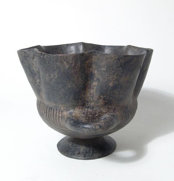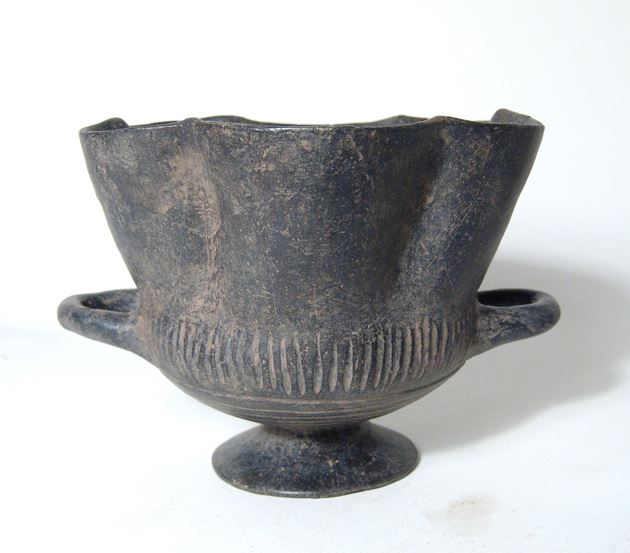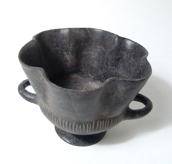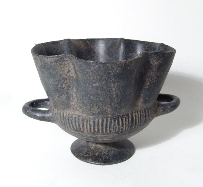 A very attractive Etruscan Bucchero cup, Italic, c. 6th Century BC, with small flared foot, the body decorated with vertical and horizontal lines, the rim scalloped with a loop handle to either side. H: 3 7/8 in 9.8 cm); W: 5 ¾ in (14.6 cm). An attractive example with nicely burnished surfaces and light deposits. Ex Southern California private collection.