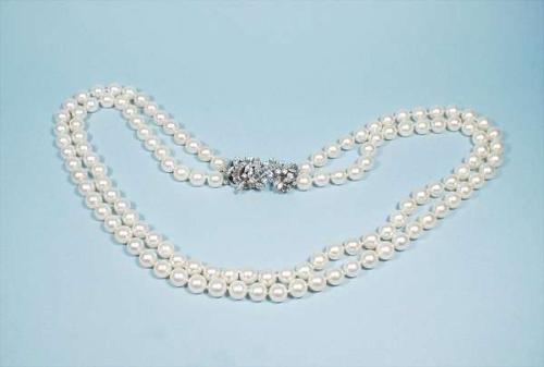 A very fine 9 - 9.5 mm double stranded cultured pearl necklace, 12" long, exceptional colour and quality, joined by a large diamond set clasp, mounted with an arrangement of baguette and circular cut diamonds. 13000-15000