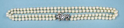 A very fine 9 - 9.5 mm double stranded cultured pearl necklace, 24" long, exceptional colour and quality, joined by a large diamond set clasp, mounted with an arrangement of baguette and circular cut diamonds.