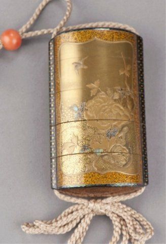 A four-case inro by Kajikawa. 18th/19th centuries. Both sides with a design of birds and flowers, surrounded by a Somada style border all on a gold mura-nashiji field contained in a a shield-shaped gold takamakie, gyobu, and aogai design against a gold fundame ground. Signed Kajikawa Bunryosai. 3 1/2" x 2". The Helen & Jack Mang Collection Tenney (Dave) Tokyo, Japan