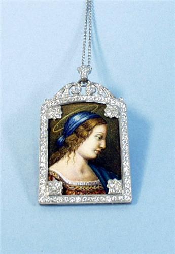 A very fine platinum and diamond pendant. Set with a rectangular enameled plaque hand painted with the portrait of the Madonna, diamond set borders with scroll designs. On platinum chain.