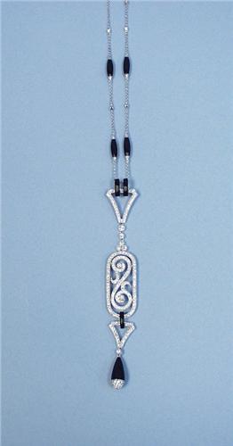 A very good Art Deco design 18 kt. white gold, diamond and onyx pendant and a complementary diamond and onyx chain. Central diamond set shield ornament hung with a black onyx drop. Total diamond weight 2.3O cts. Unusual design. Hallmarked.
