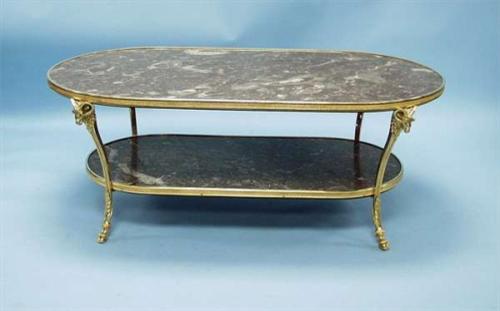 A very good French Empire style gilt bronze and marble 2-tier low table. Oval top and stretcher with a polished rouge marble surface. Raised on gilt bronze scroll legs with ram's head chutes and feet sabots. 47" x 26 1/2", 18" high. 6000-7000