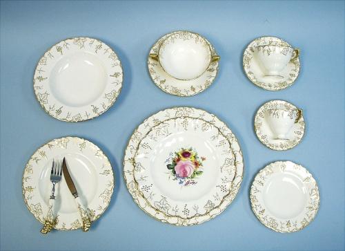 A very good Royal Crown Derby dinner service in the "Vine " pattern. Consists of 12 dinner plates, 12 soup bowls and 12 salad plates, 11 bread plates, 4 mocha cups and 12 matching saucers,11 tea cups and 12 matching saucers, 17 bouillon cups and 21 matching saucers, 1 creamer with a hand painted saucer, 11 large complementary dessert plates with hand painted floral designs. Also included is a flatware service comprising 11 dessert knives and forks and 7 serving pieces including a boxed carving set. Fully marked.