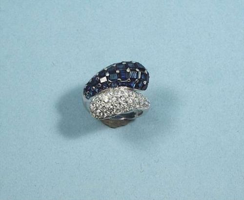 A very good Van Cleef design platinum and diamond band ring. Bypass style, with pave set diamond and calibre cut sapphire terminals. 5000-6000