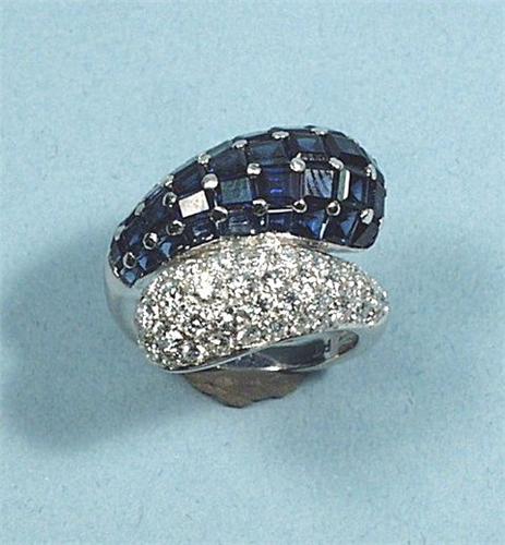A very good Van Cleef design platinum and diamond band ring. Bypass style, with pave set diamond and calibre cut sapphire terminals.