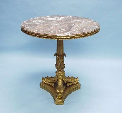 A very good pair of antique Italian gilt bronze and marble circular tables. The rouge marble circular top with bronze rim raised on a grooved columnar support. Three feet in form of stylized fish, mounted on a triangular base. Top 31" diameter, 32" high. 16000-18000EA