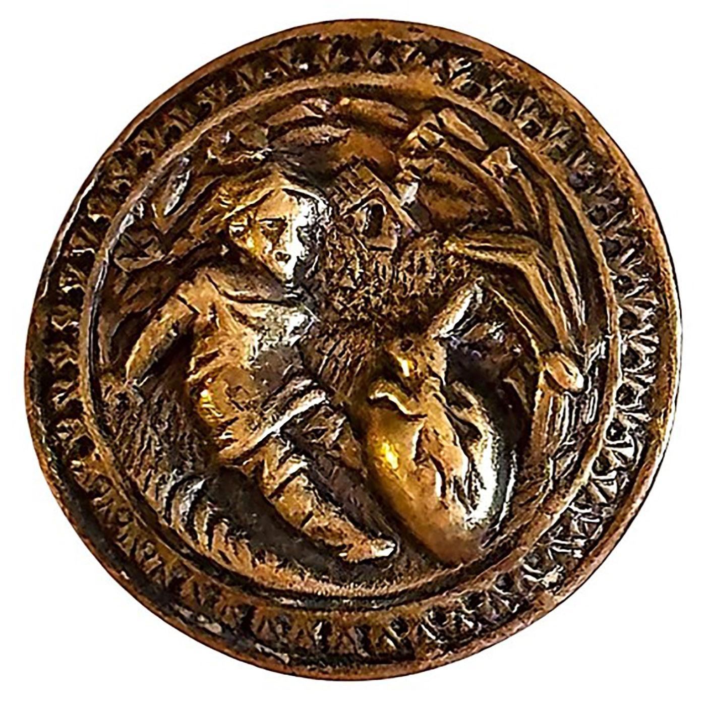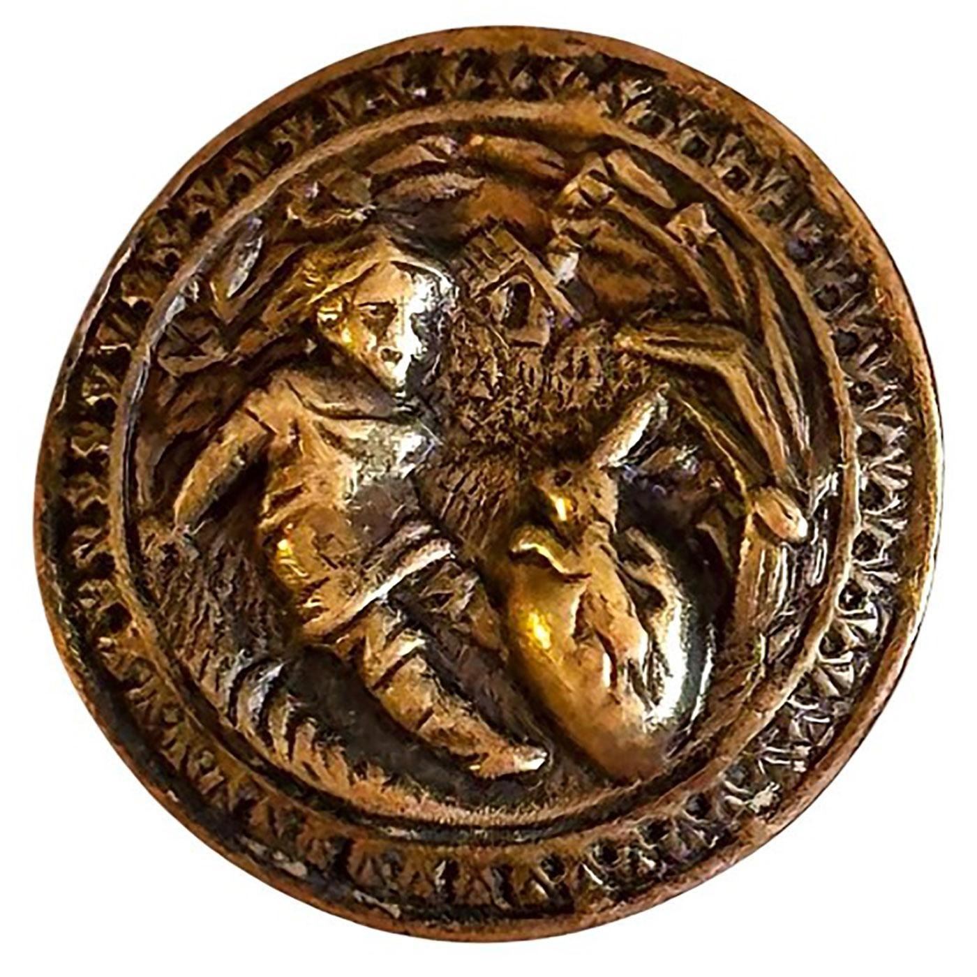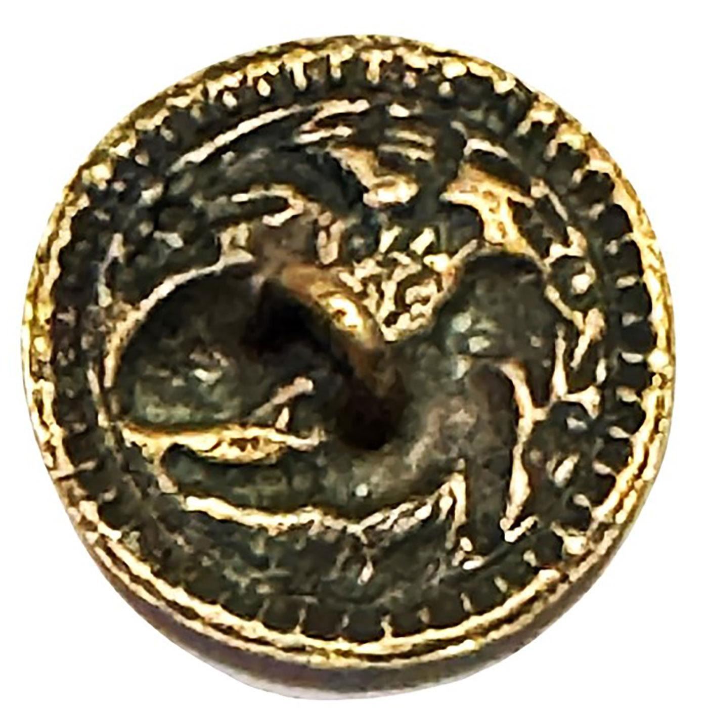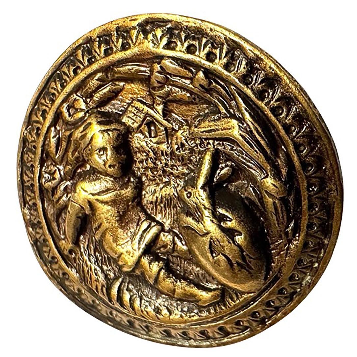 1 Small size 19th century brass childrens button with a Rabbit. When first shown this button by the consignor Bruce thought it was strange to be offered such a small picture button to put up by itself in this auction, until further explanation and examination was undertook. We have never seen this unsusal pictorial before. It shows what appears to be a child standing aside a cracked open egg with a rabbit coming out of it. The button is perhaps a story about Easter or something like that. The detail on this small button is truly incredible and we hope you all agree.