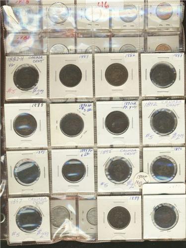 A very large accumulation of Canadian decimal coins. Large cents 1882H to 1900H except 1898H, small cents: 1922 to 1939 except 1937. Grades vary from VG to BU. Five cents: 1922 to 1939 except 1925, grades vary from VG to EF. Ten cents: 1928 to 1939 V