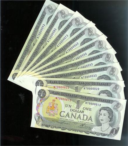 A very neat "LOW NUMBERED"set of 1973 $1 notes. Includes Serial #0000012, 0000022, 0000032, 0000042, 0000052, 0000062, 0000072, 0000082, 0000092. All nine notes are gem uncirculated!