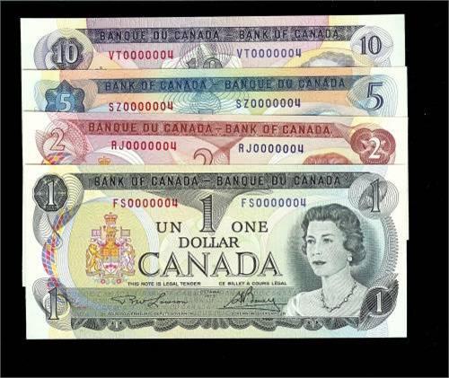 A very nice and attractive #0000004 set! Includes 1973 $1 FS0000004, 1974 $2 RJ0000004, 1972 $5 SZ0000004, 1971 $10 VT0000004. All Gem uncirculated with Lawson-Bouey signatures. Very scarce!