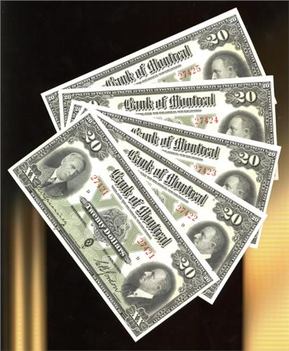 A very nice and attractive consecutive run of small size chartered notes! The Bank of Montreal 505-62-06 1938 $20 x 5 consecutive notes 27421 to 27425. All original AU-UNC. Seldom offered!