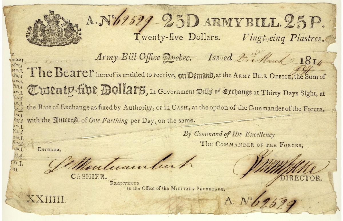 A very rare Lage format ARMY BILL from the WAR of 1812-1815. 'THE CHARLTON PLATE'. An ARMY BILL from Quebec Issue of 1814, $25. No. 69529. PMG VG-8 NET. The Bill reads: 'ARMY Bill Office Quebec, Issued 2sd March 1814. The Bearer hereof is entitled to receive, on DEMAND at the ARMY BILL OFFICE, the sum of Twnty-five dollars, in Government Bills of Exchange at Thirty days Sight, at the Rate of Exchange as fixed by Authority, or in Cash, at the opinion of the Commander of the Forces, with the Interest of ONE Farthing per Day, on the same. By Command of His Excellency, The Commander of the Forces. Signed by Louis Montizambert. Fine condition, with a few tears, and thin tear line in the middle of the note. As pictured in 2010 Charlton book, page 4. Most known Army Bills are the small format type from the 1814 issue. Other than notes in institutions, like the National Currency Collection, We have recorded only two other examples. Of the highest rarity! Worth a premium bid.