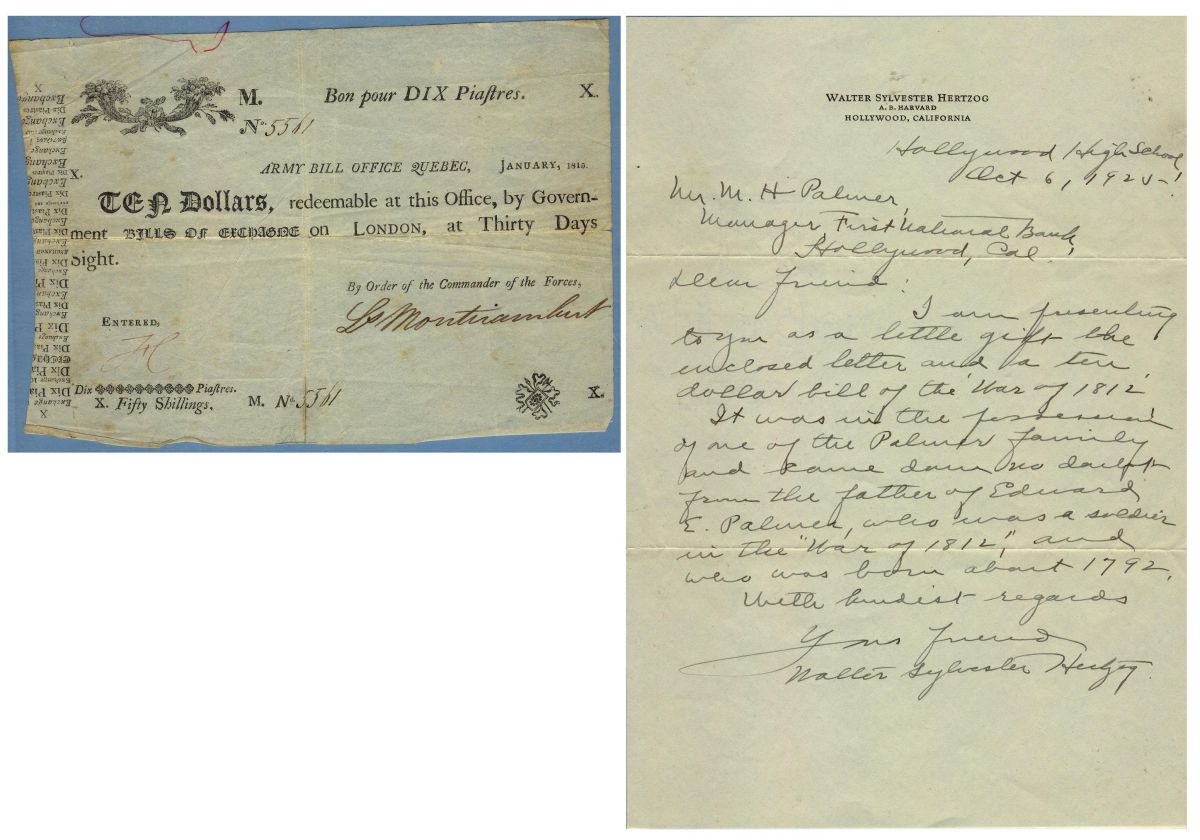 A very rare Large format ARMY BILL from the WAR of 1812-1815. An ARMY BILL from the final Quebec Issue of 1815, $10 (50 shillings). No. 5561. PMG VF-20. The Bill reads: 'ARMY Bill Office Quebec, January, 1815. Ten Dollars Redeemable at this office, by Government Bill of Exchange on London, at Thirty Days Sight, by order of the Commander of the Forces.' (Signed in ink) L. Montizambert. Louis Montizambert in the late 1700's was a volounteer in the Canadian Militia and later in life served as an aid to Lord Dalhousie, (George Ramsey, 1770-1838), Governor General of Canada. Accompanied by a hand written letter from Oct.6, 1925, tracing the pedigree of the Bill. Very fine condition, an unusually high grade example of a very rare early form of Canadian Paper money. Most known Army Bills are the small format type from the 1814 issue. Other than notes in institutions, like the National Currency Collection, We have recorded only two other examples. A Very Fine (sold in 2005) and a low grade example, (VG or so). Of the highest rarity! Worth a premium bid.