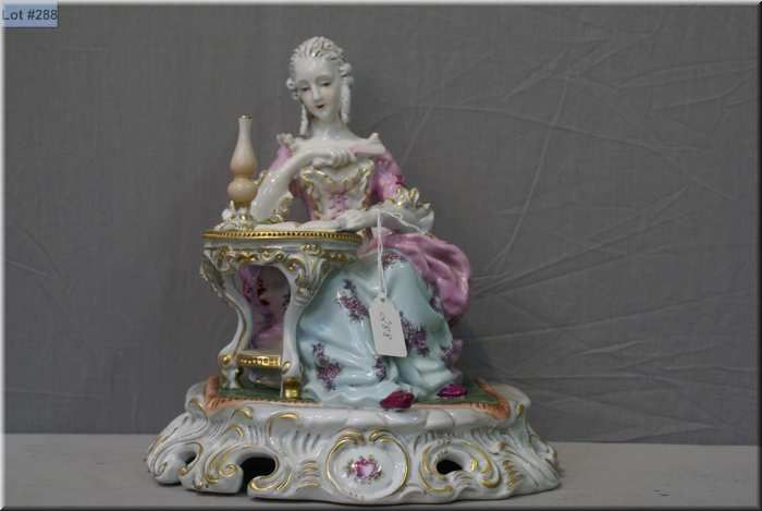 A vintage Dresden figurine of a figure in Rococo dress seated at a table reading complete with hand painted and gilt detailing 10" in height